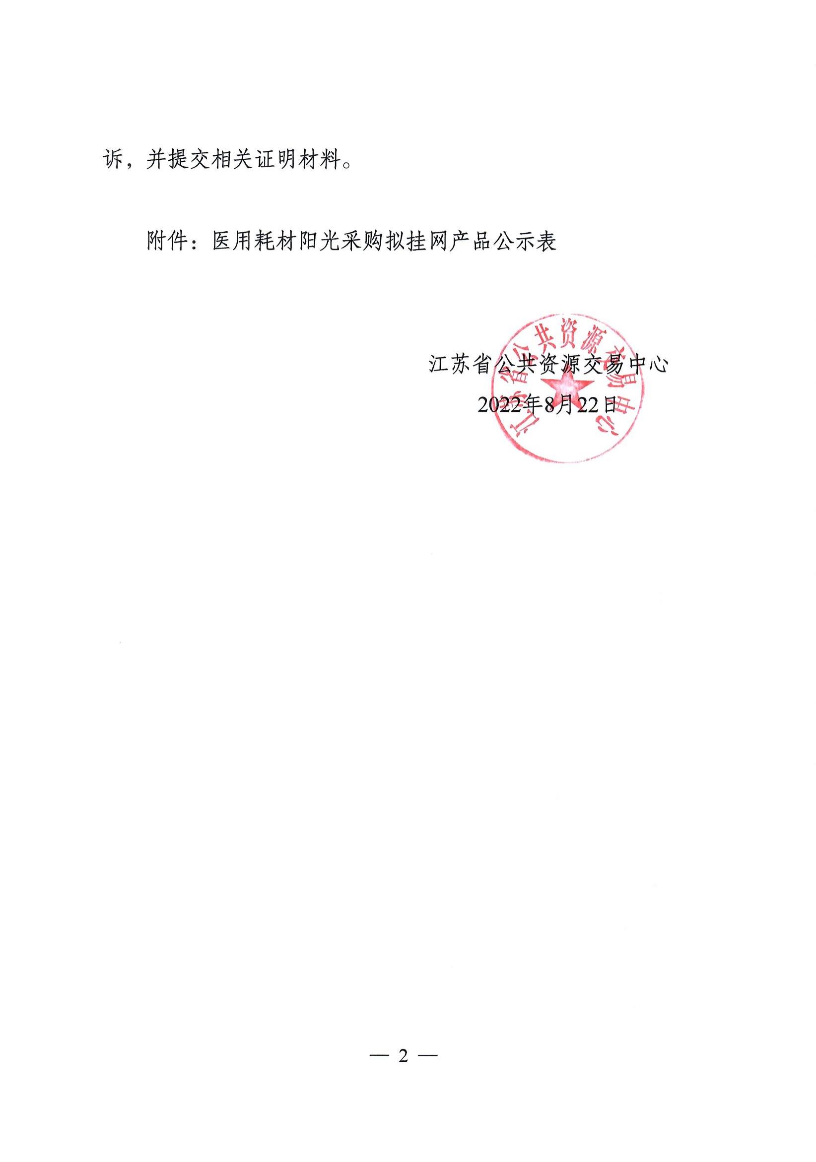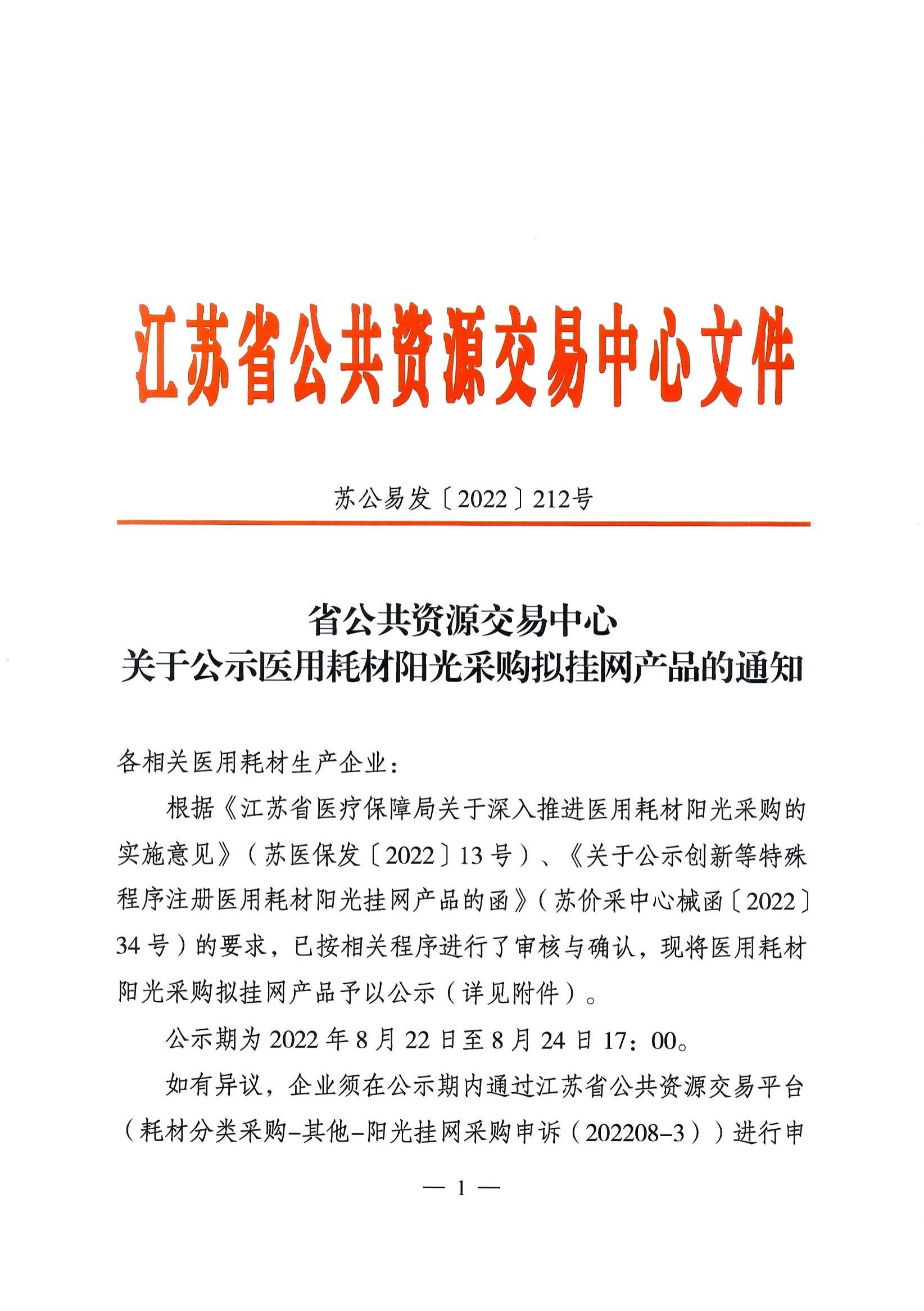 省公共资源交易中心关于公示医用耗材阳光采购拟挂网产品的通知(苏公易发〔2022〕212号)